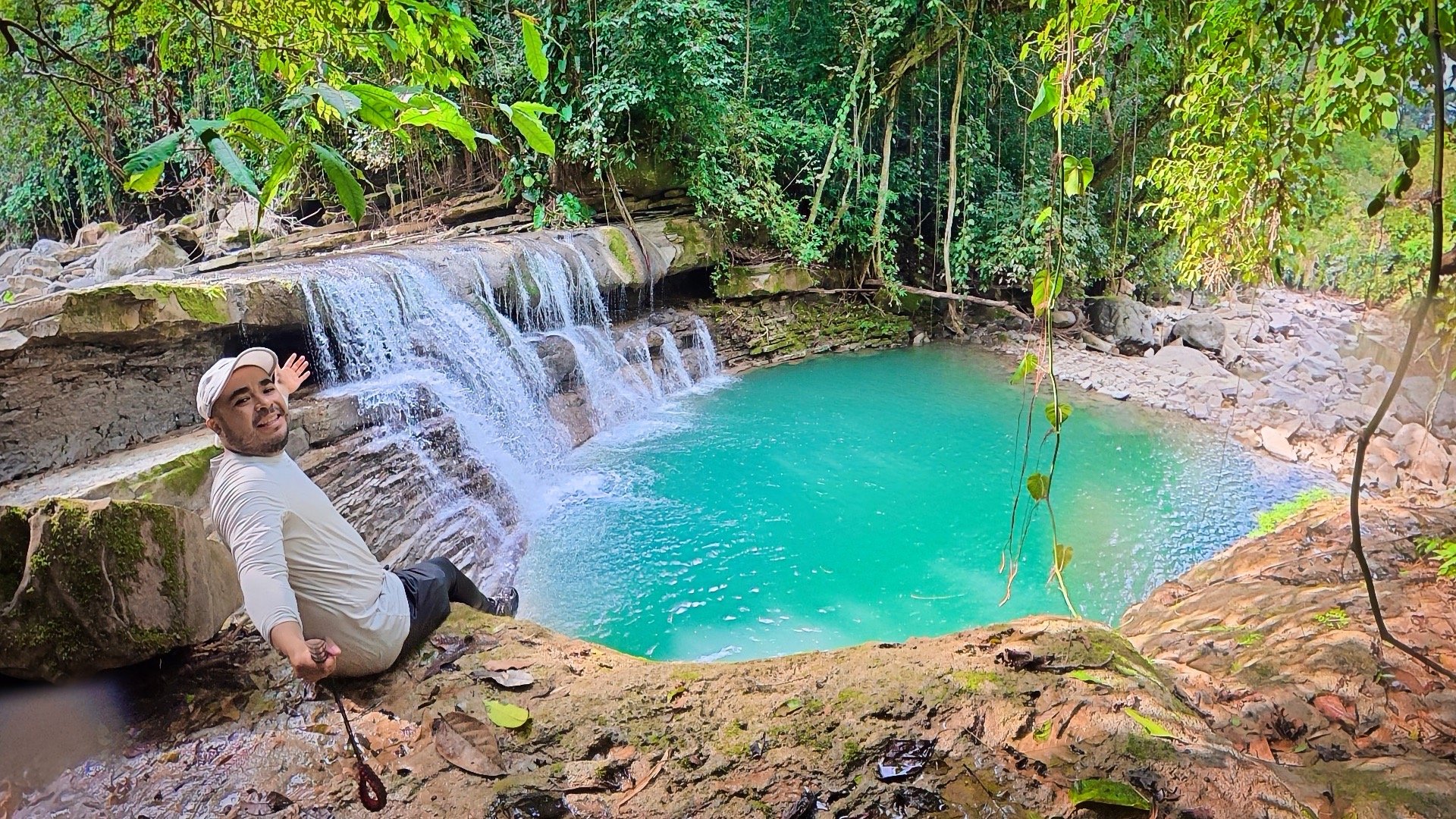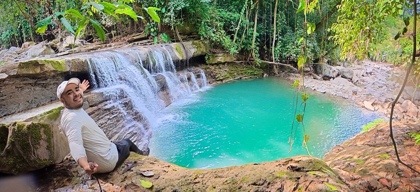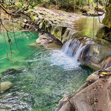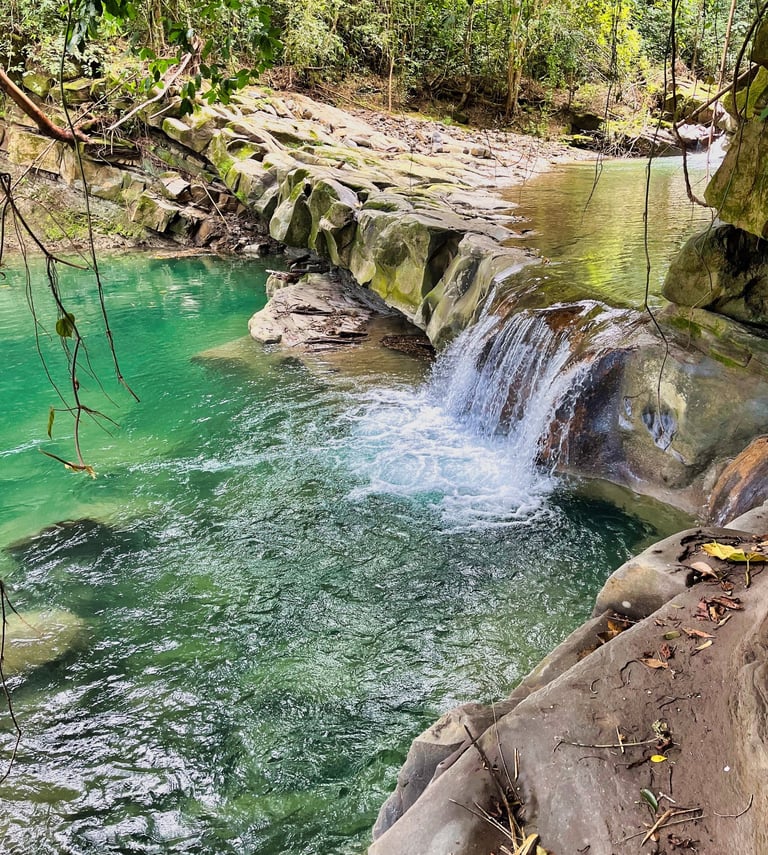 Llegamos al rio y aquí comenzó la caminata semiacuatica, caminando entre piedras agua y vistas hacia los arboles emprendimos una excelente ruta, el paisaje cambiaba y nos sorprendía con pozas de color verde eáemarlada y pequeñas cascadas que se formaban. Ese día que fuimos estaba nublado por un norte que había entrado, pero regularmente hace mucho mucho calor, de pronto sentíamos el bochorno pero el agua y su frescura nos equilibraba la temperatura.