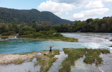 Lo más tranqui seria ver las cascadas que están a un lado del restaurante, son muy bonitas están cayendo en un pequeño cañón y visualmente son encantadoras. También muy cerca de ahí hay una especie de playitas donde se puede nadar, algunas partes muy bajitas para los niños y otras partes un poco mas hondas. En general hace mucho calor y el agua es fría, el calor es tanto que no te importa que esté fría solo te quieres refrescar.