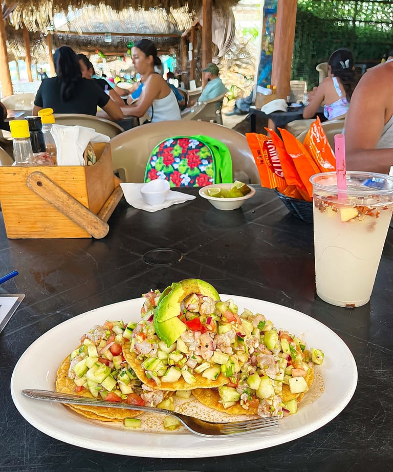 Para comer les recomiendo ir a Morena mia, este restaurante se encuentra en un extremo de la playa en una zona mas tranquila pero ideal para comer, aqui obviamente la especialidad son los mariscos, yo me pedí unas tostadas de ceviche de camarón y estaban muy ricas. Ubicación https://maps.app.goo.gl/fnVAR1FJnZoKUBTM7